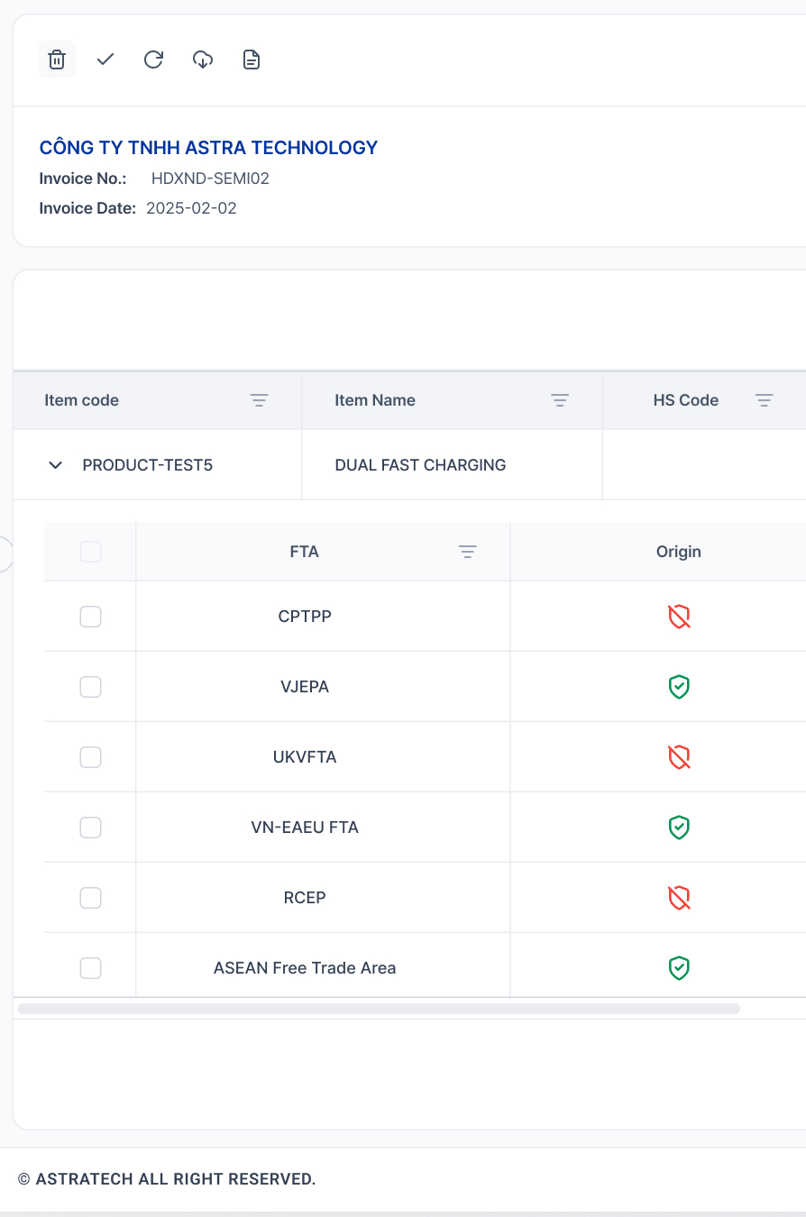 - Tự động kiểm tra đủ điều kiện xuất xứ theo hiệp định.